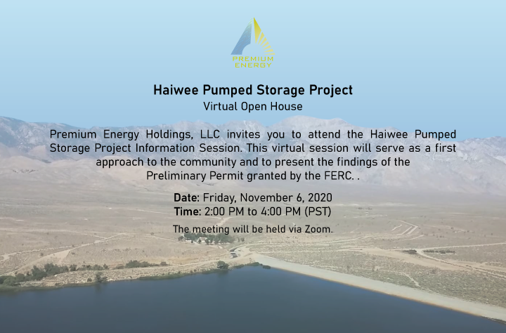 Premium Energy Holdings, LLC invites you to attend the Haiwee Pumped Storage Project Information Session. This virtual session will provide information.