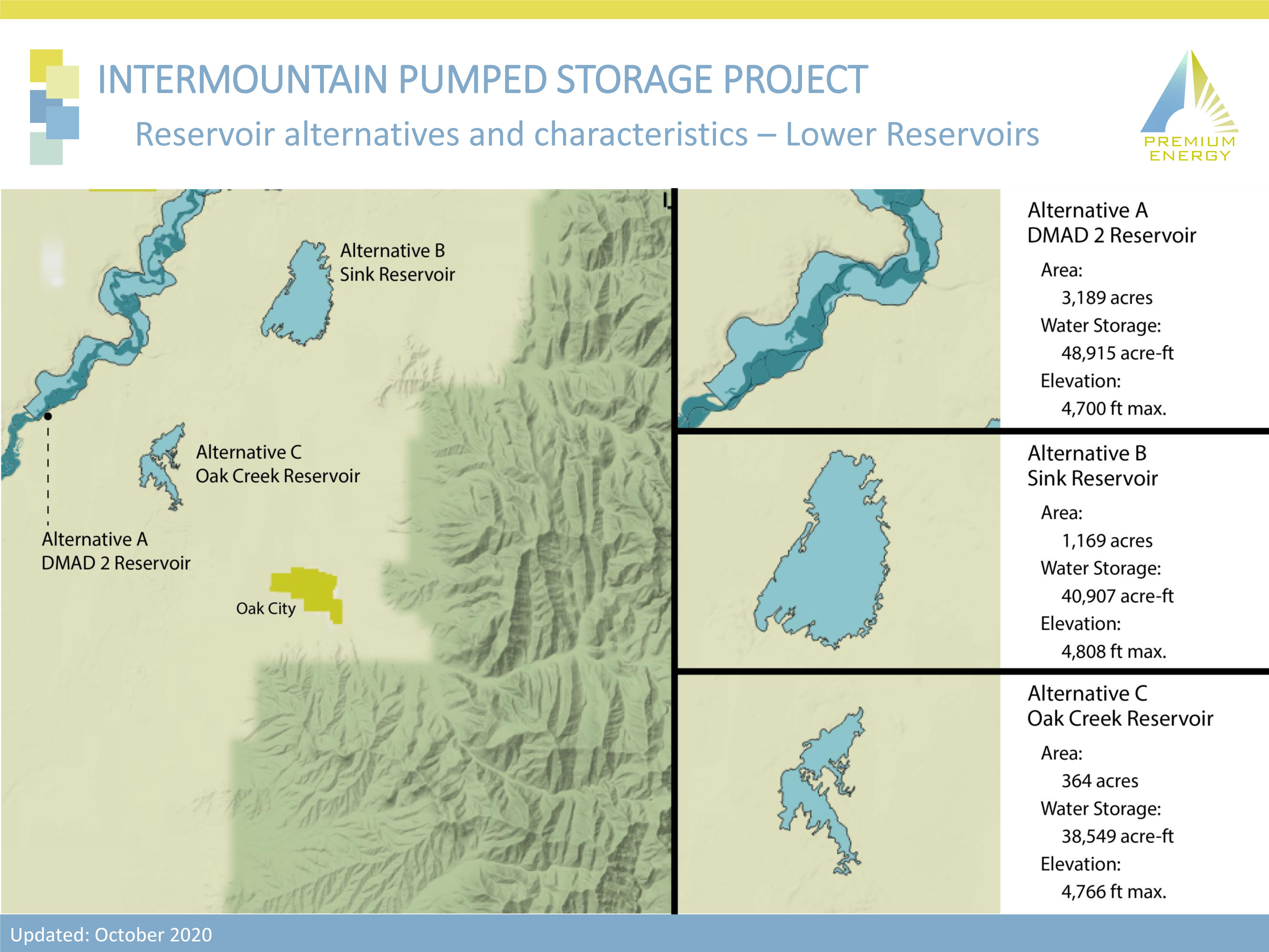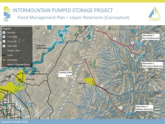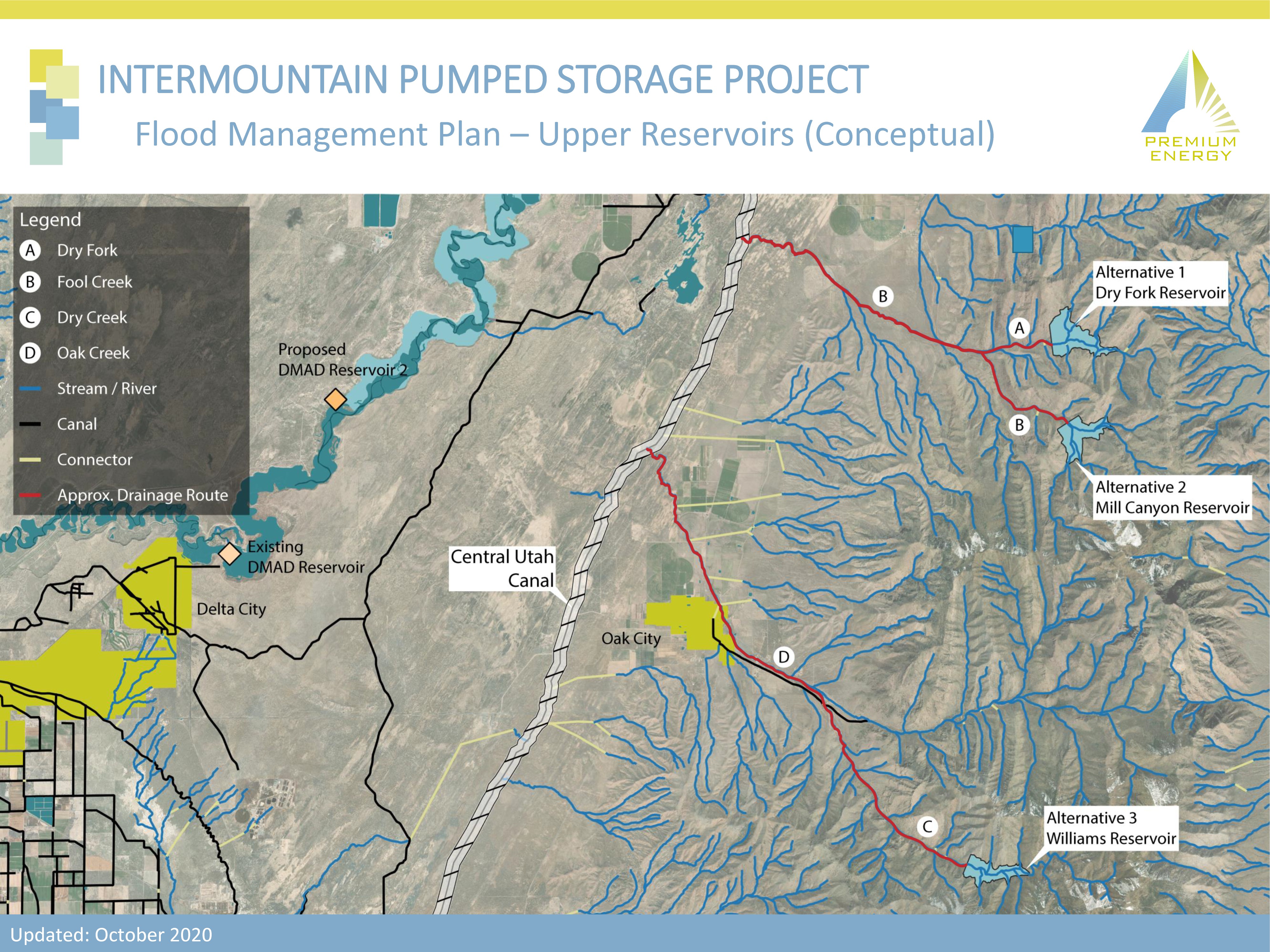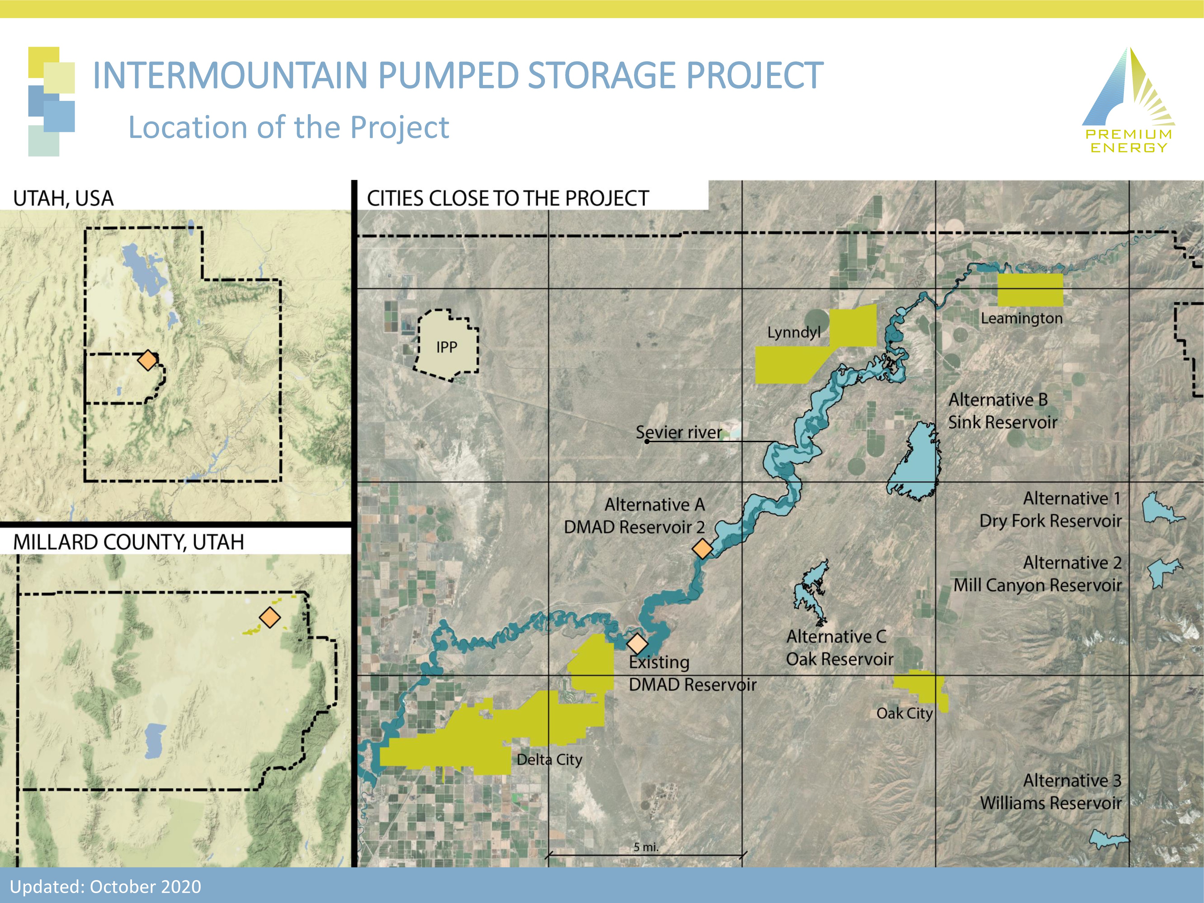 The Intermountain Project will be located northeast of Delta City within Millard County, Utah. The project is a proposed 2000-megawatt (MW) pumped storage project that would use a proposed DMAD 2 Reservoir as the lower reservoir, one mile upstream of the existing DMAD Reservoir. The proposed upper reservoir, could be any of the three proposed, located east of the project in the Canyon Mountains Range.