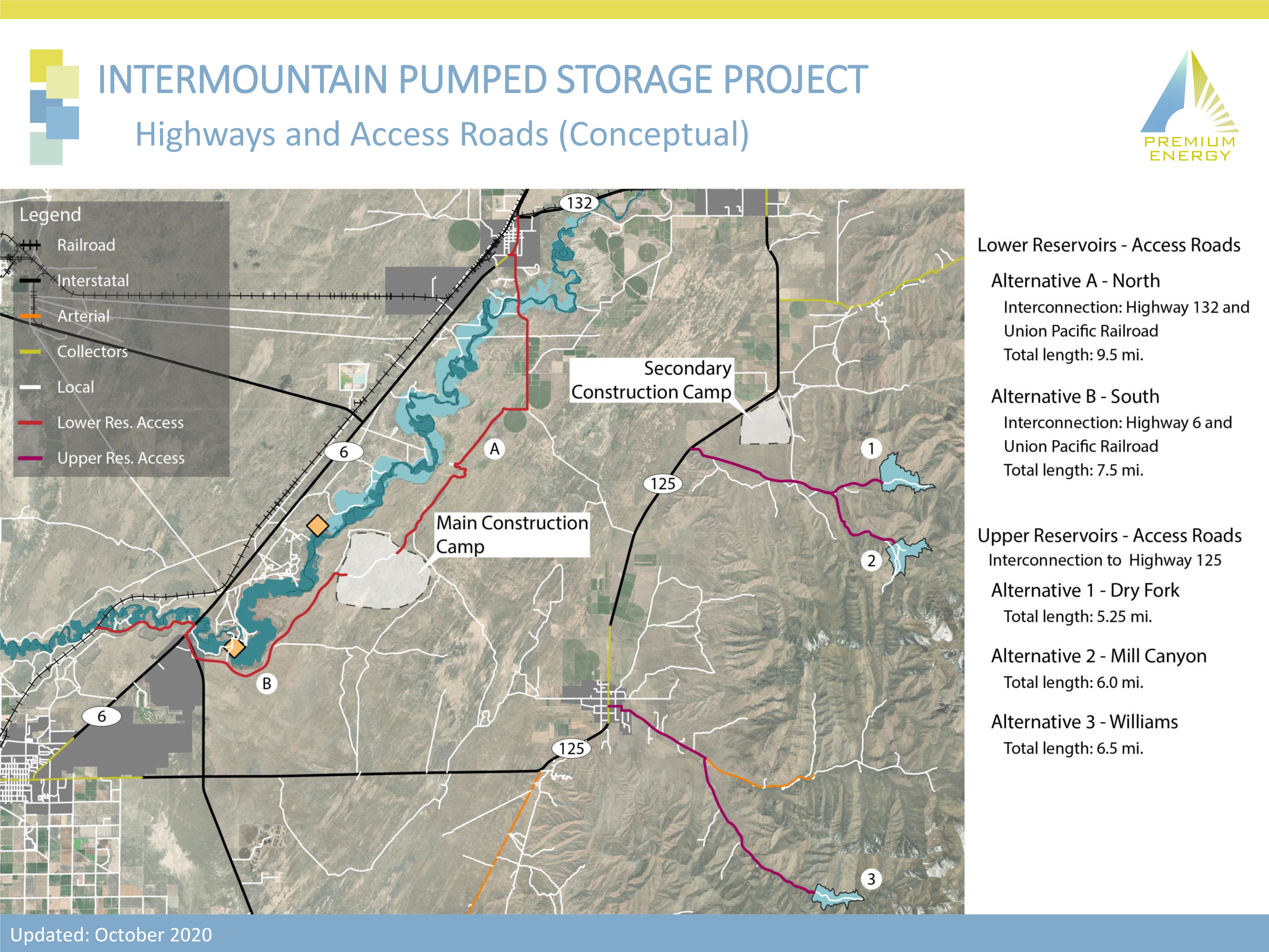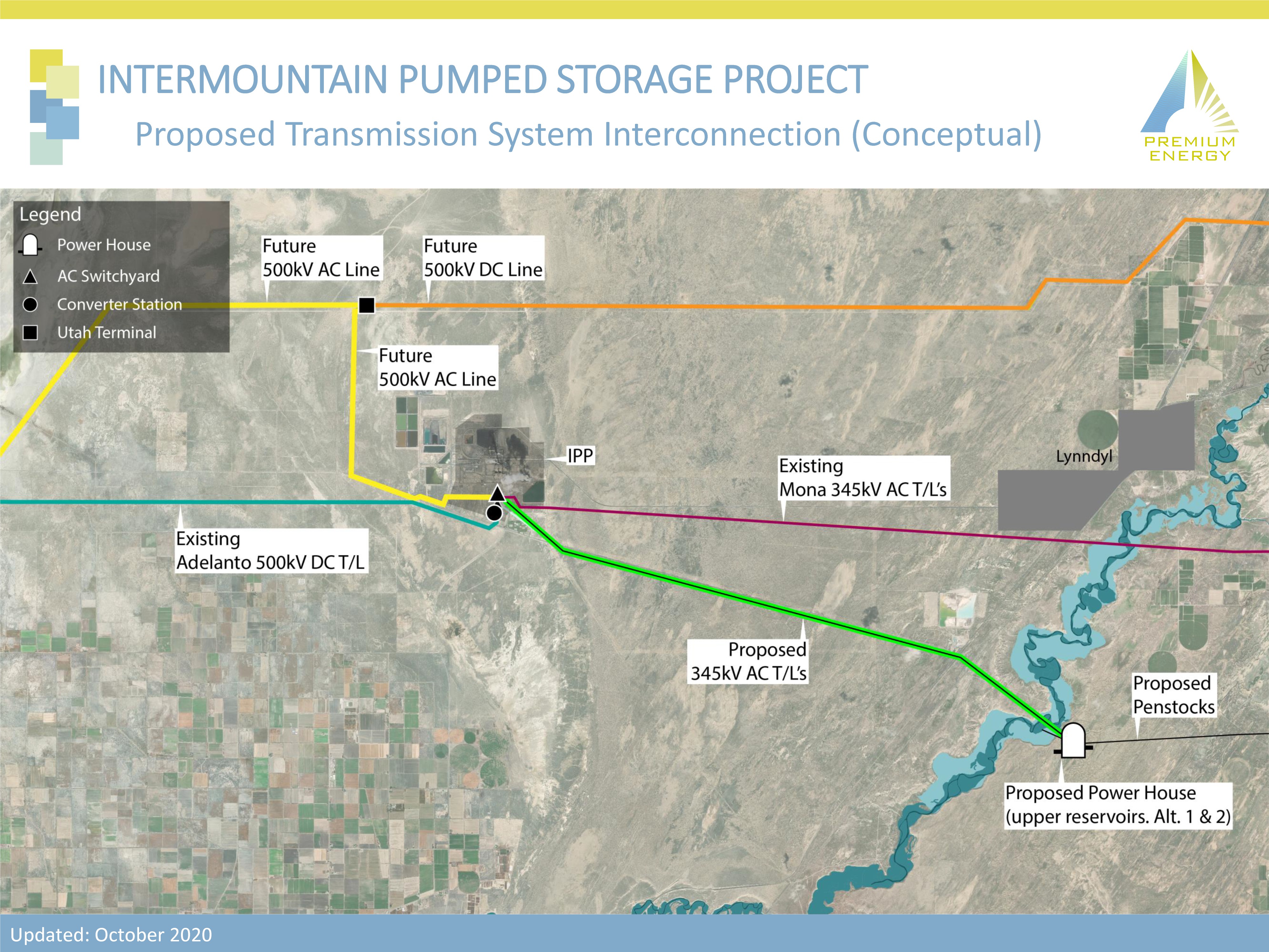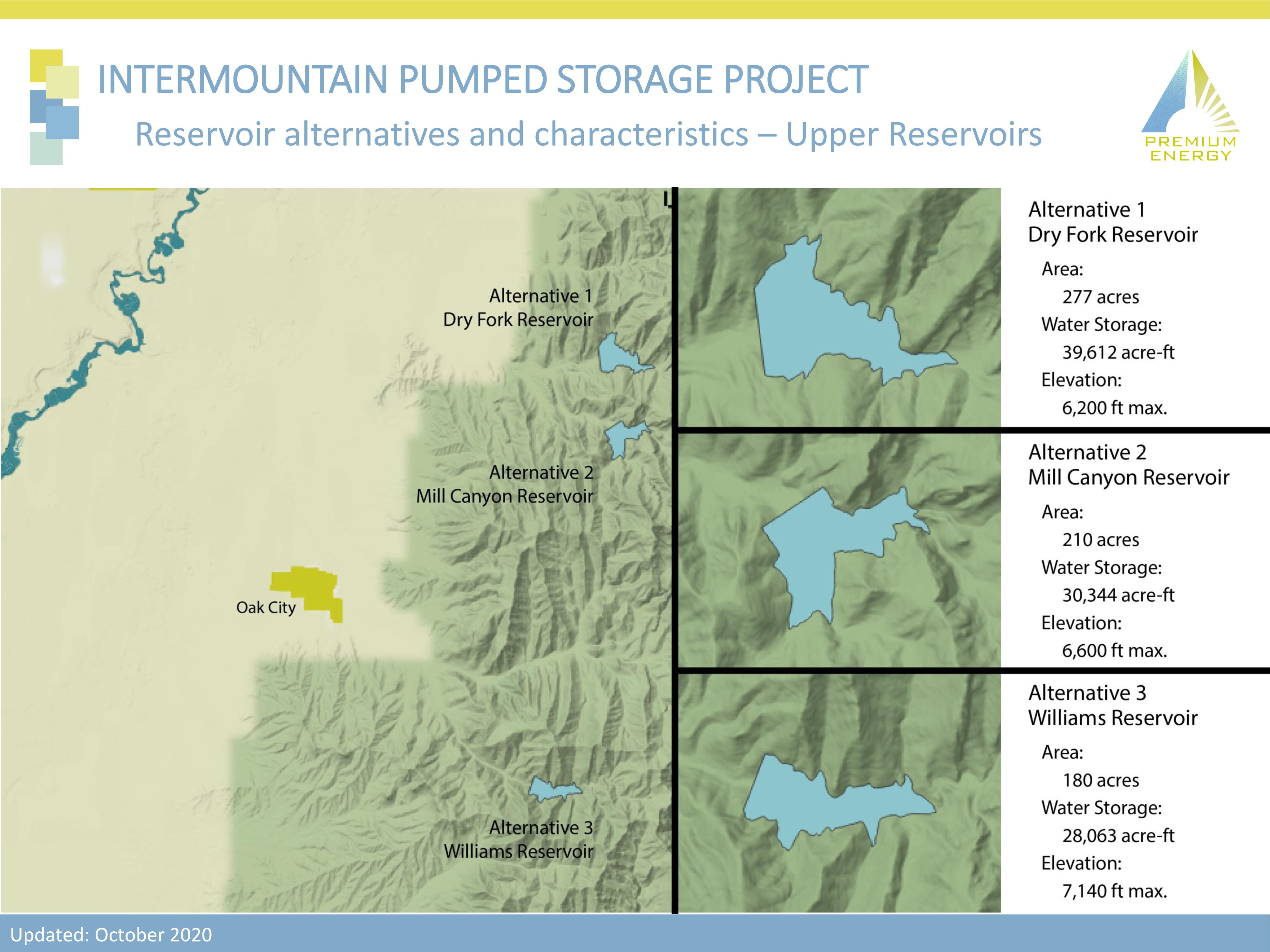 The Intermountain Project will be located northeast of Delta City within Millard County, Utah. The project is a proposed 2000-megawatt (MW) pumped storage project that would use a proposed DMAD 2 Reservoir as the lower reservoir, one mile upstream of the existing DMAD Reservoir. The proposed upper reservoir, could be any of the three proposed, located east of the project in the Canyon Mountains Range.