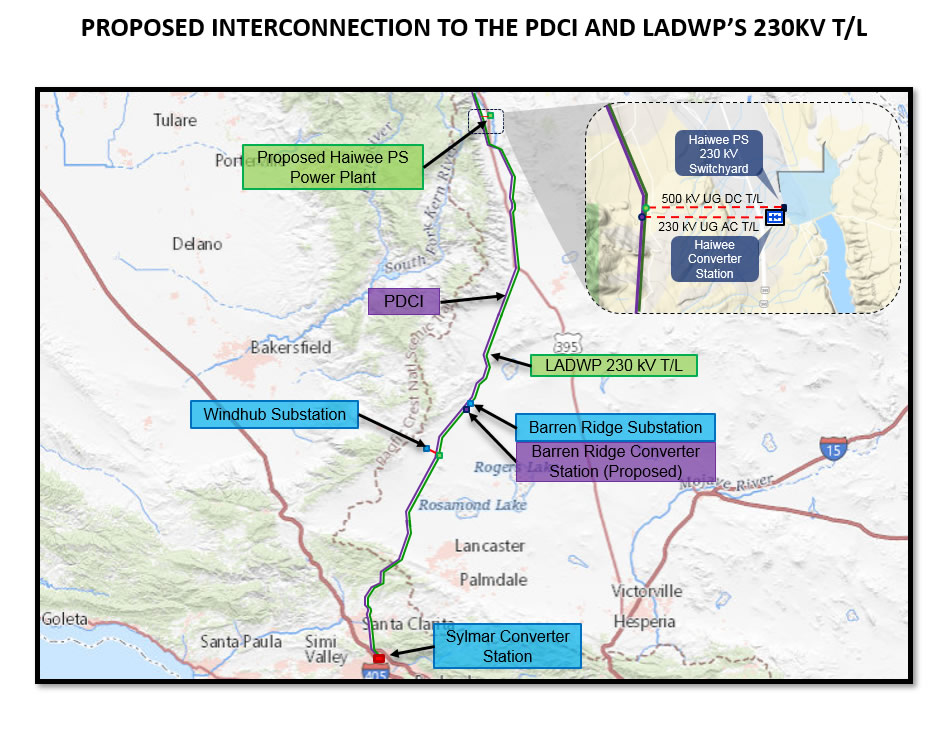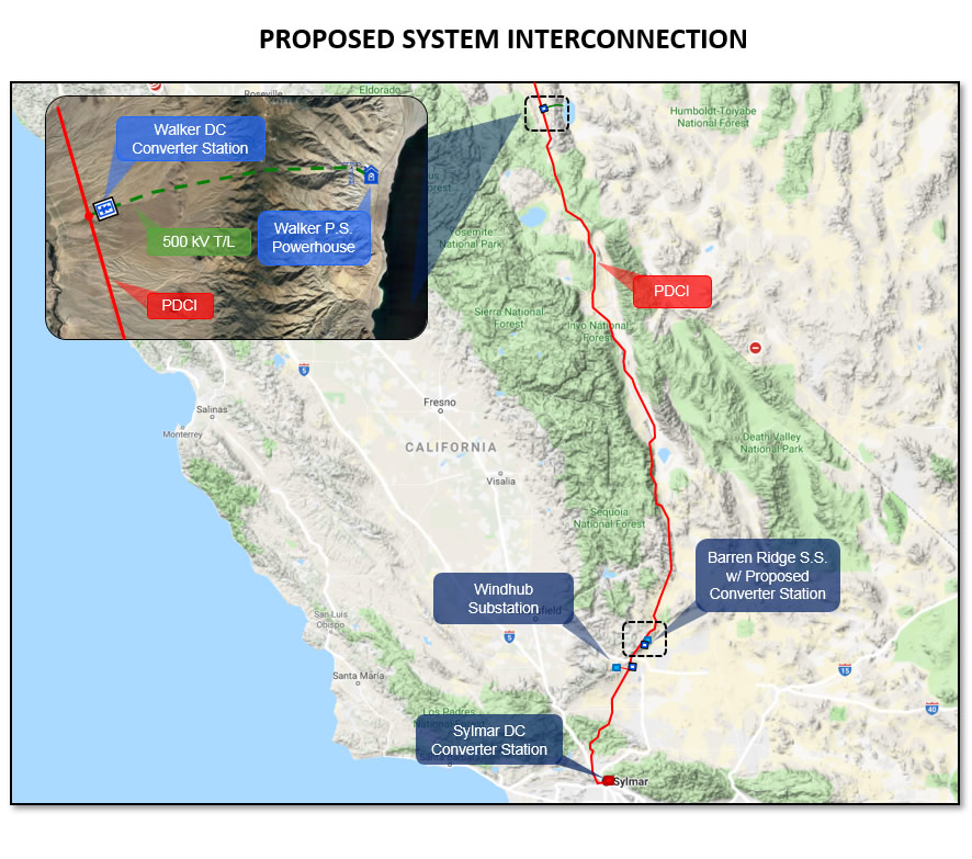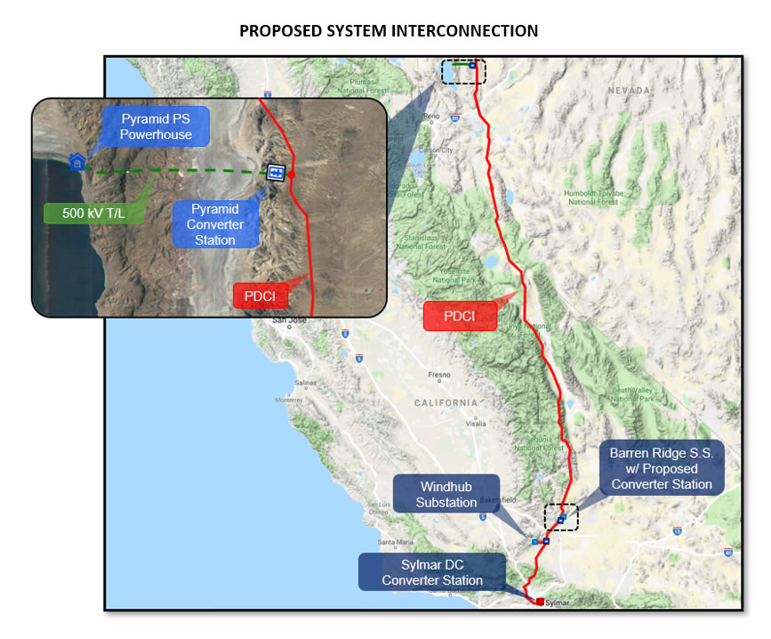 The proposed Pyramid Lake Pumped Storage Project is expected to have a nominal capacity of 2,000 MW. The interconnection voltage would be 500 kV. The project would interconnect with the existing PDCI and transmit the power to Los Angeles, California. The interconnection of the Pyramid Lake Switchyard to the PDCI will require a new Pyramid converter station. From there, the power would be transmitted to Sylmar Converter Station in the Los Angeles area.