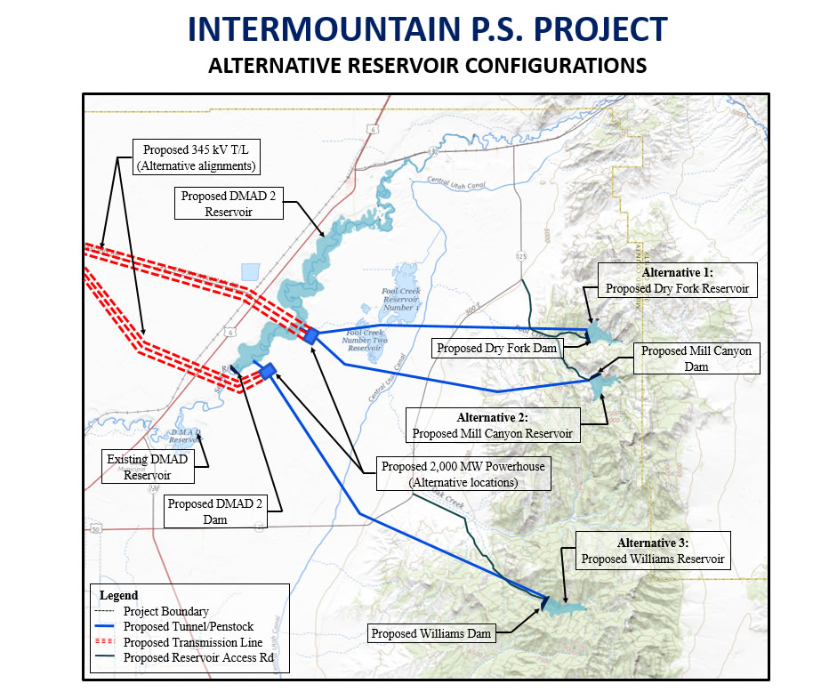 The new DMAD 2 reservoir would store enough water for project operation and allow for additional water storage to be used for irrigation and water conveyance. Alternatives for an upper reservoir to operate the Intermountain Pumped Storage Power Plant would require the construction of a new embankment to create a new reservoir in the Canyon Mountains east of the new DMAD 2 Reservoir. The new upper reservoir alternatives are listed below: