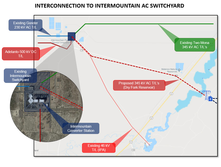 The project proposes interconnection with the existing Intermountain AC Switchyard. The Intermountain Pumped Storage Power Plant would interconnect to the Intermountain AC Switchyard using two new 345 kV transmission lines. In order to deliver the generated power to the regional electrical utility network, the following transmission paths will be available: