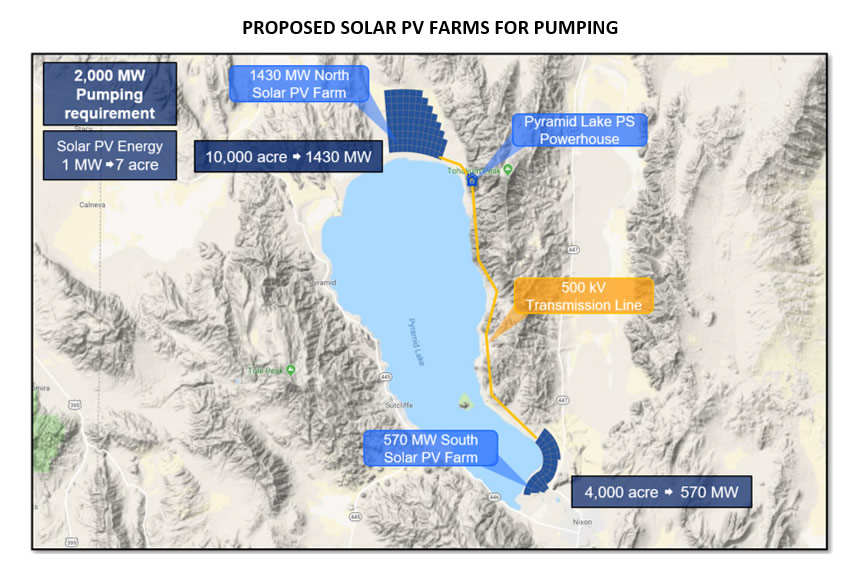 In order to store renewable energy and maximize pumped storage operation, the project proposes a new solar PV farm in the northern or southern shore of the Pyramid Lake. The proposed solar farm would use 14,000 acres of land for the installation of solar panels. The solar farms would generate 2,000 MW of solar PV energy. This energy would be produced and stored during low-demand hours. The Pyramid Lake Pumped Storage Project would then be able to generate 2,000 MW of carbon free electricity when demand is high. Additionally, the project could tentatively interconnect to the existing Windhub Substation for storing wind energy. Other electrical utilities in California and Nevada are also expected to be interested in the project.
