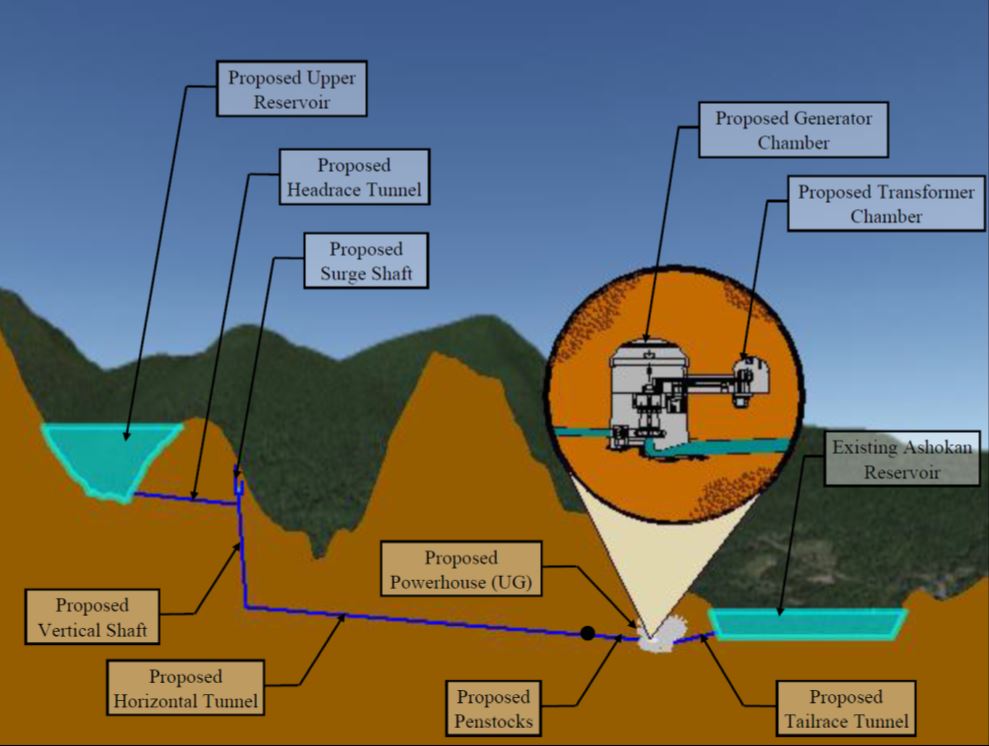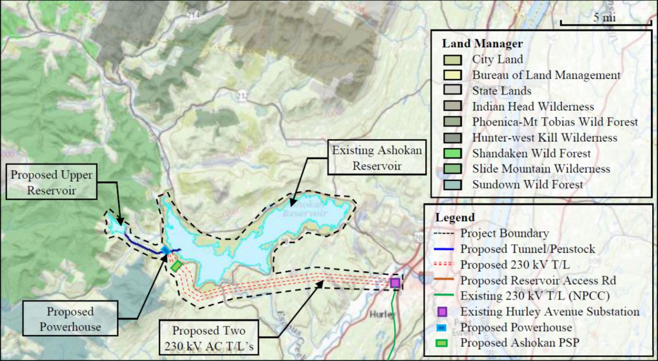 Located in upstate NY using the Ashokan reservoir and proposes an alternative for the construction of an upper reservoir with a total area of 226 acres and a volume of 25,558 acre-ft that can be built in the surrounding area, as can be seen in figure 1. The proposed interconnection uses 230kV transmission lines linking the new substation with the existing Hurley Av. Substation as shown in Figure 1. According to our reservoir alternative, the project could generate the following: